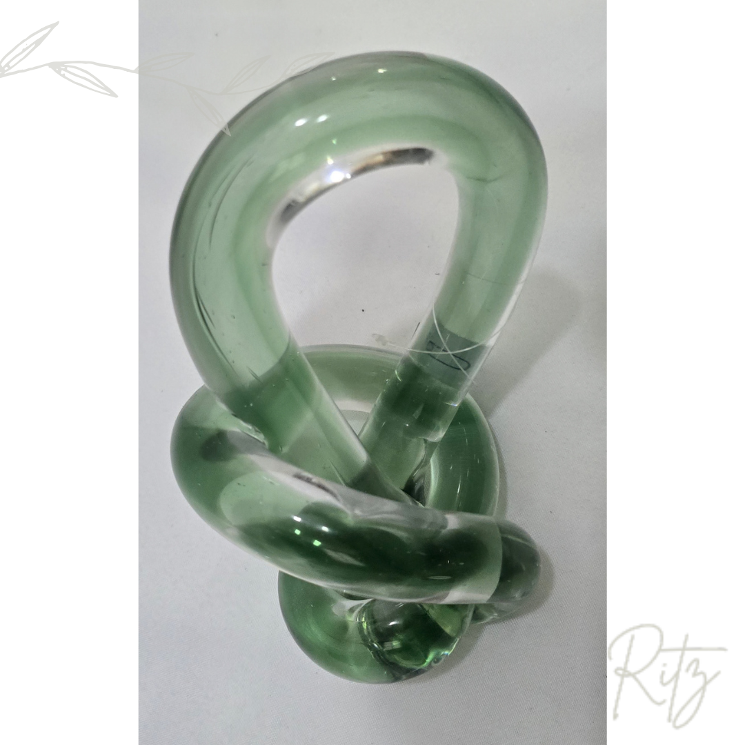 Descrição: escultura nó em vidro verde translucido, estilo Murano, peça ideal para dar um toque especial em sua decoração.
