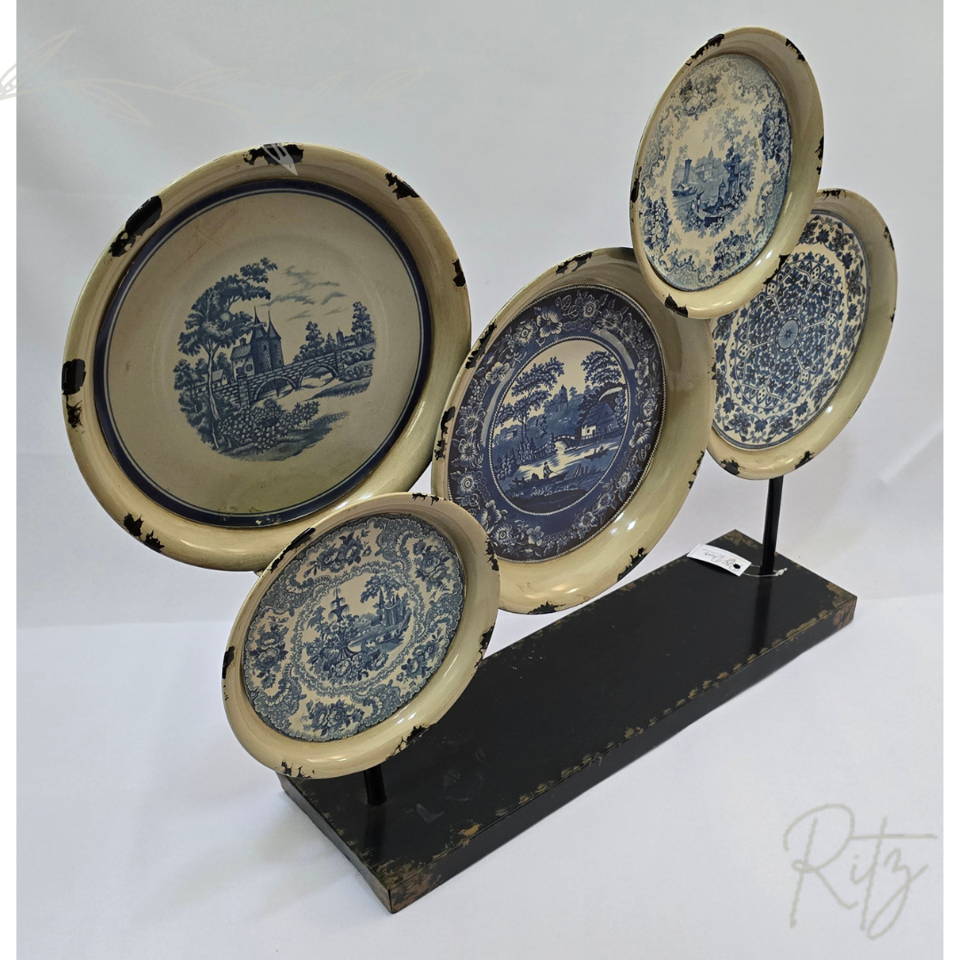 Descrição: escultura de pratos em azul e branco, estilo português em metal.