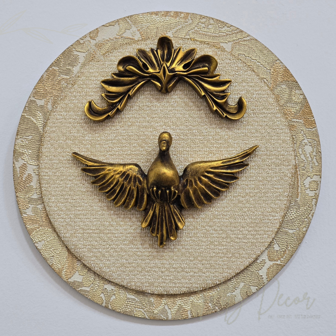 Descrição: quadro redondo com Espirito Santo na cor dourada, com aplicação de papel de parede.