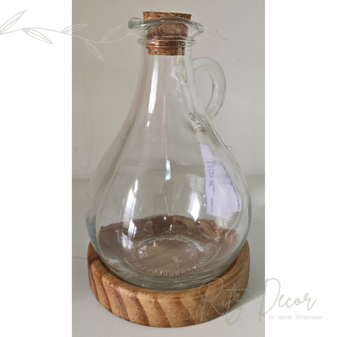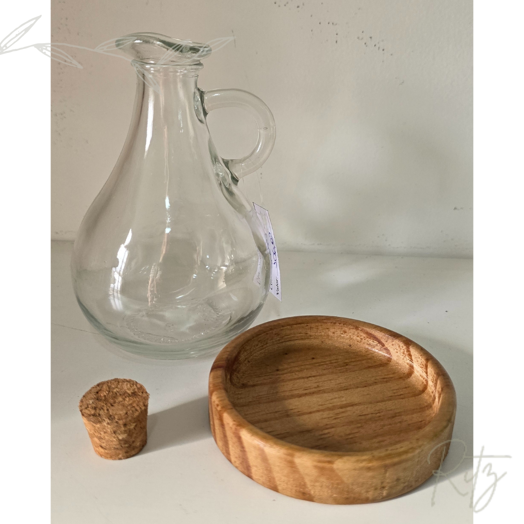 Descrição: garrafinha em vidro com tampa de rolha e base (pratinho) em madeira, pode ser usada para azeite, vinagre ou molho.
