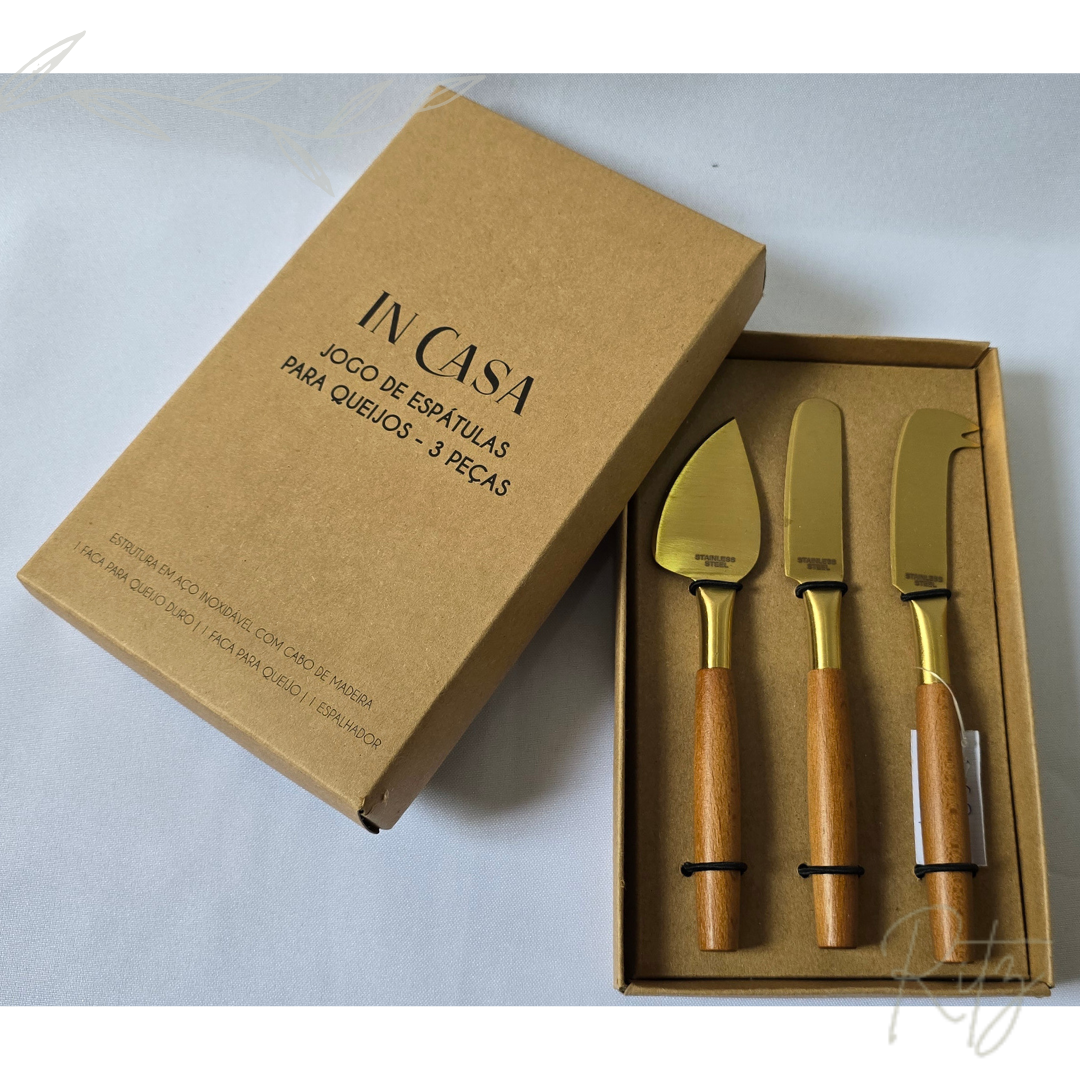 Descrição: jogo com uma faca para queijo duro, uma faca para queijo e um espalhador em aço inoxidável com cabo em madeira, cor dourada.