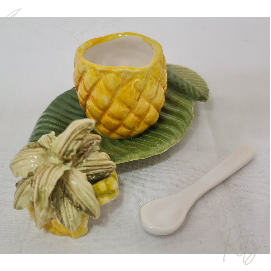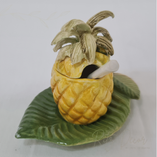 Descrição: porta geleia pequeno de abacaxi com colher, da coleção da Zanatta Casa. Belíssima peça para compor sua mesa posta.