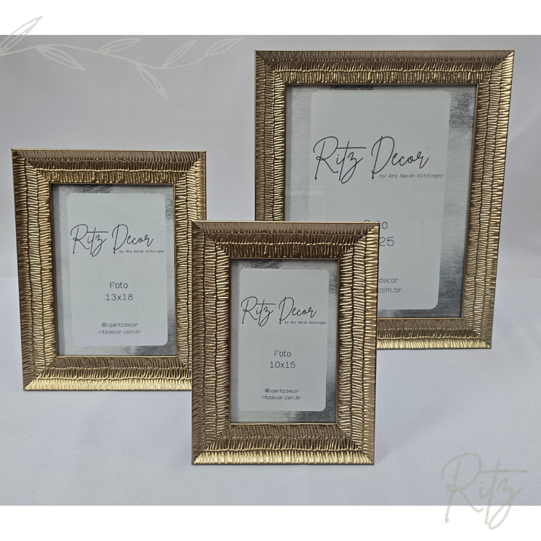 Descrição: porta retrato com textura dourado. Pode ser usado para foto na vertical ou horizontal e possui ganchos para usar na parede.