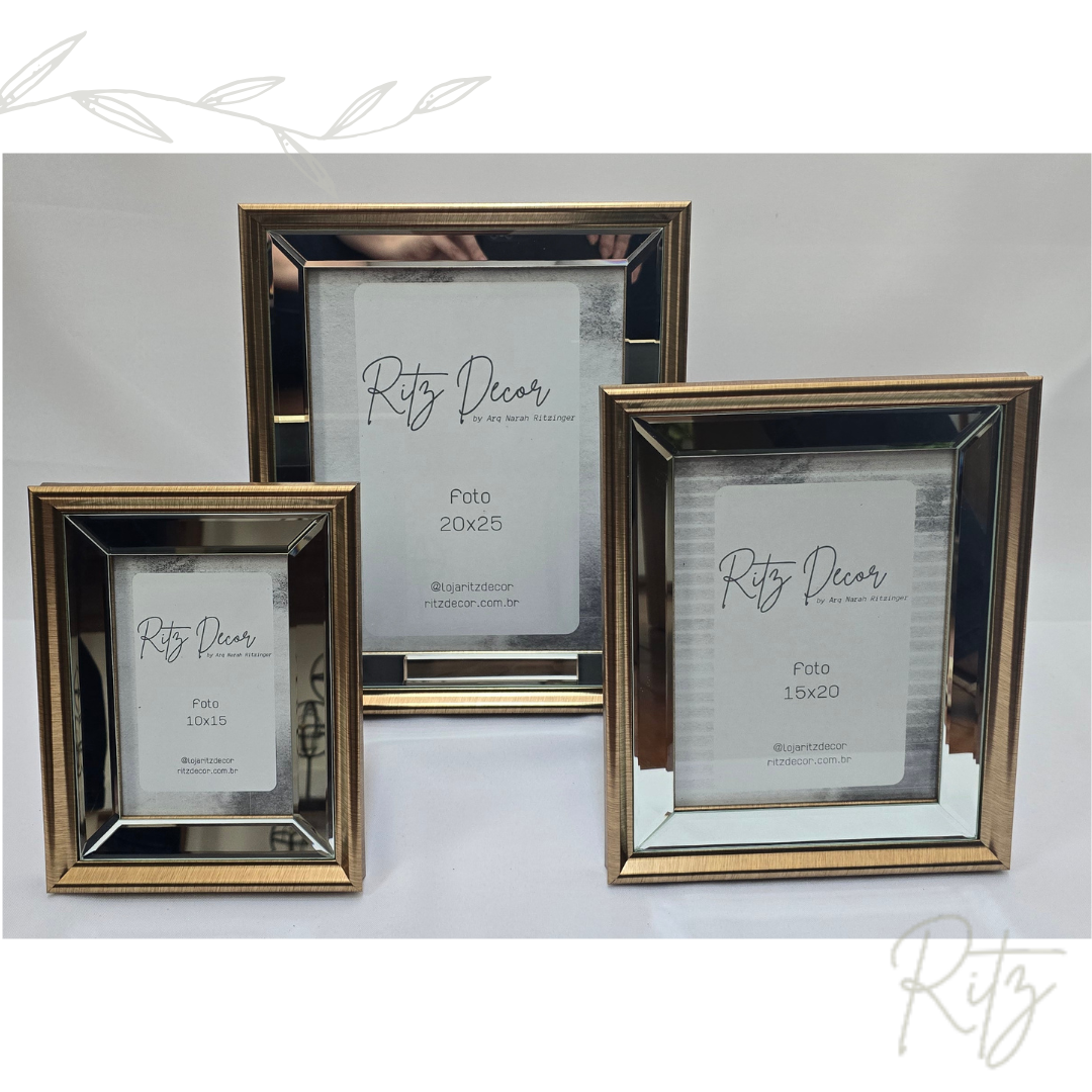 Descrição: porta retrato dourado envelhecido e espelho. Pode ser usado para foto na vertical ou horizontal e possui ganchos para usar na parede.
