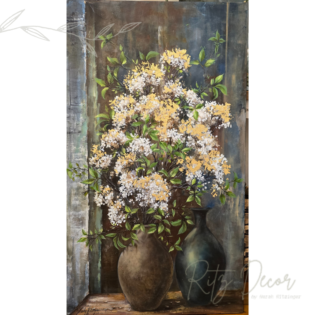 Descrição: tela de potes com folhas e flores com detalhes em dourado, com fundo azul pintado a mão, belíssima tela para dar um toque especial a sua parede.