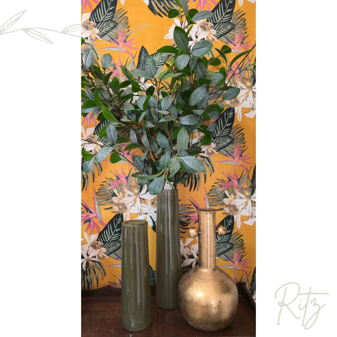 Descrição: vaso cilíndrico em vidro verde, pode ser usado em diversas composições de ambientes residenciais e comerciais, com ou sem plantas.