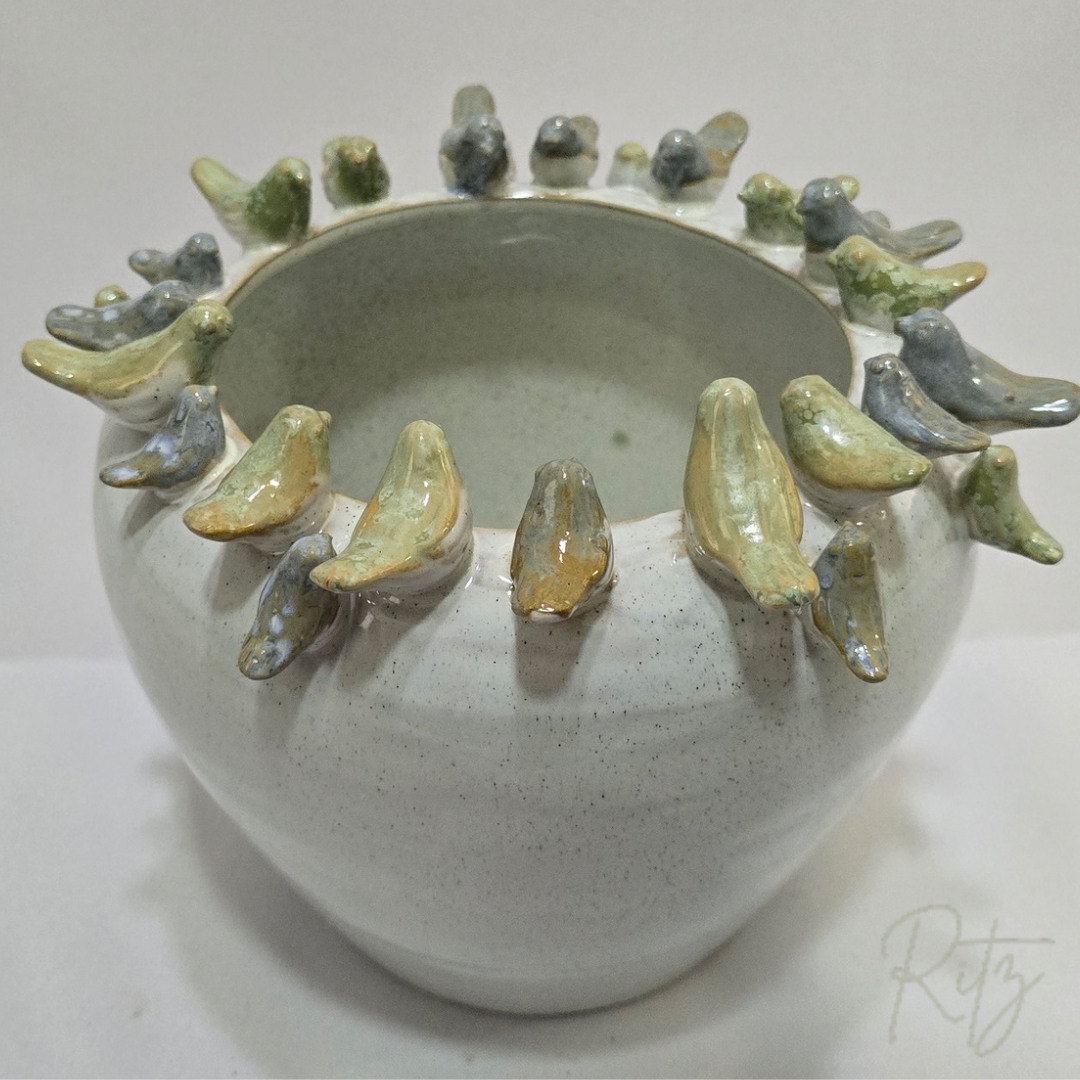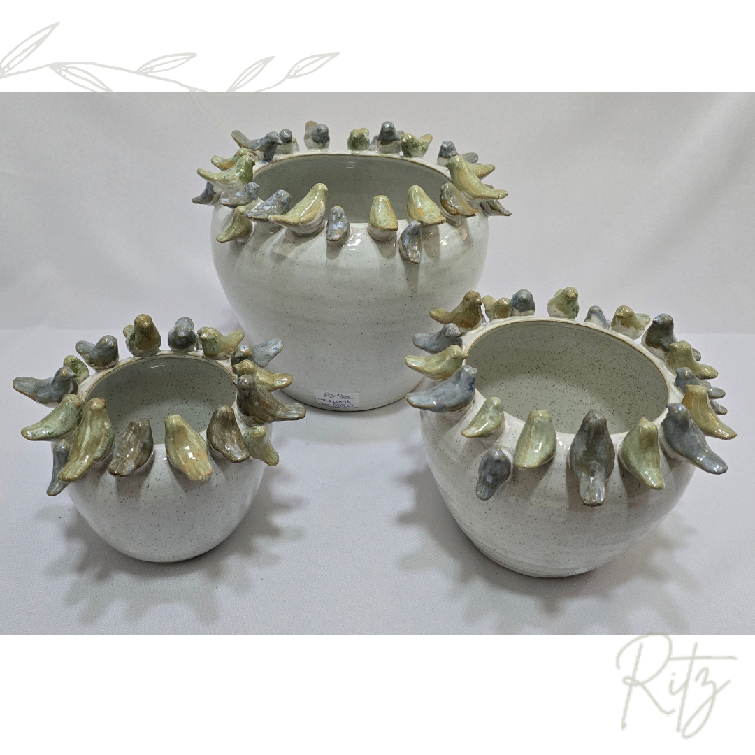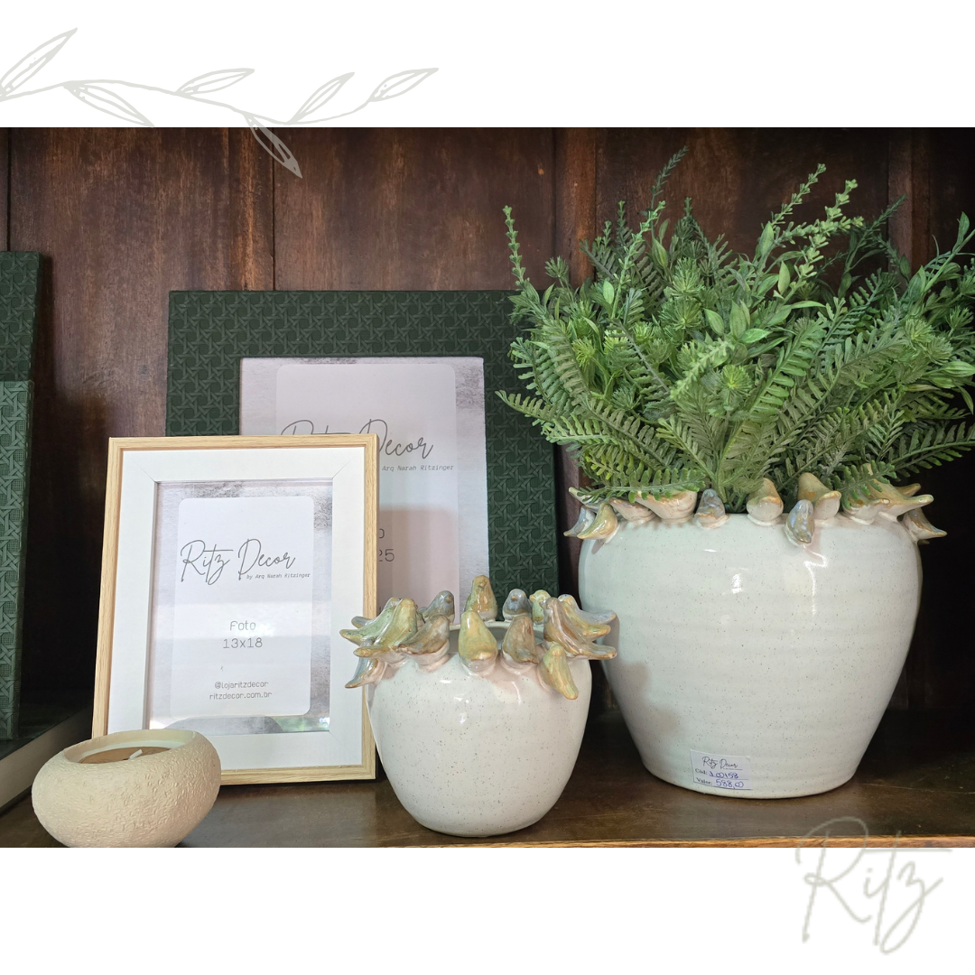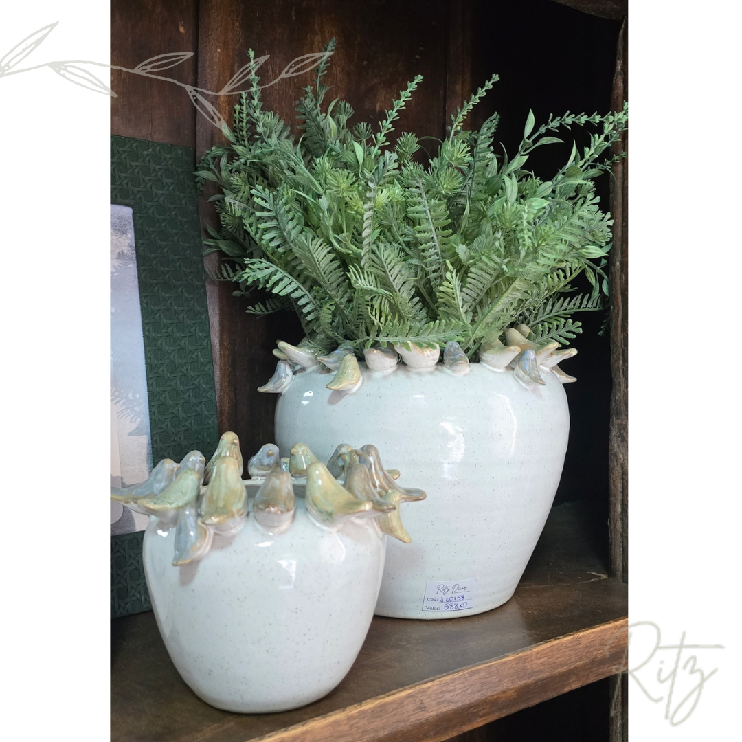 Descrição: vaso/cachepot com passarinhos em cerâmica, em tons pasteis, pode ser usado em diversas composições de ambientes residenciais e comerciais, com ou sem plantas.
